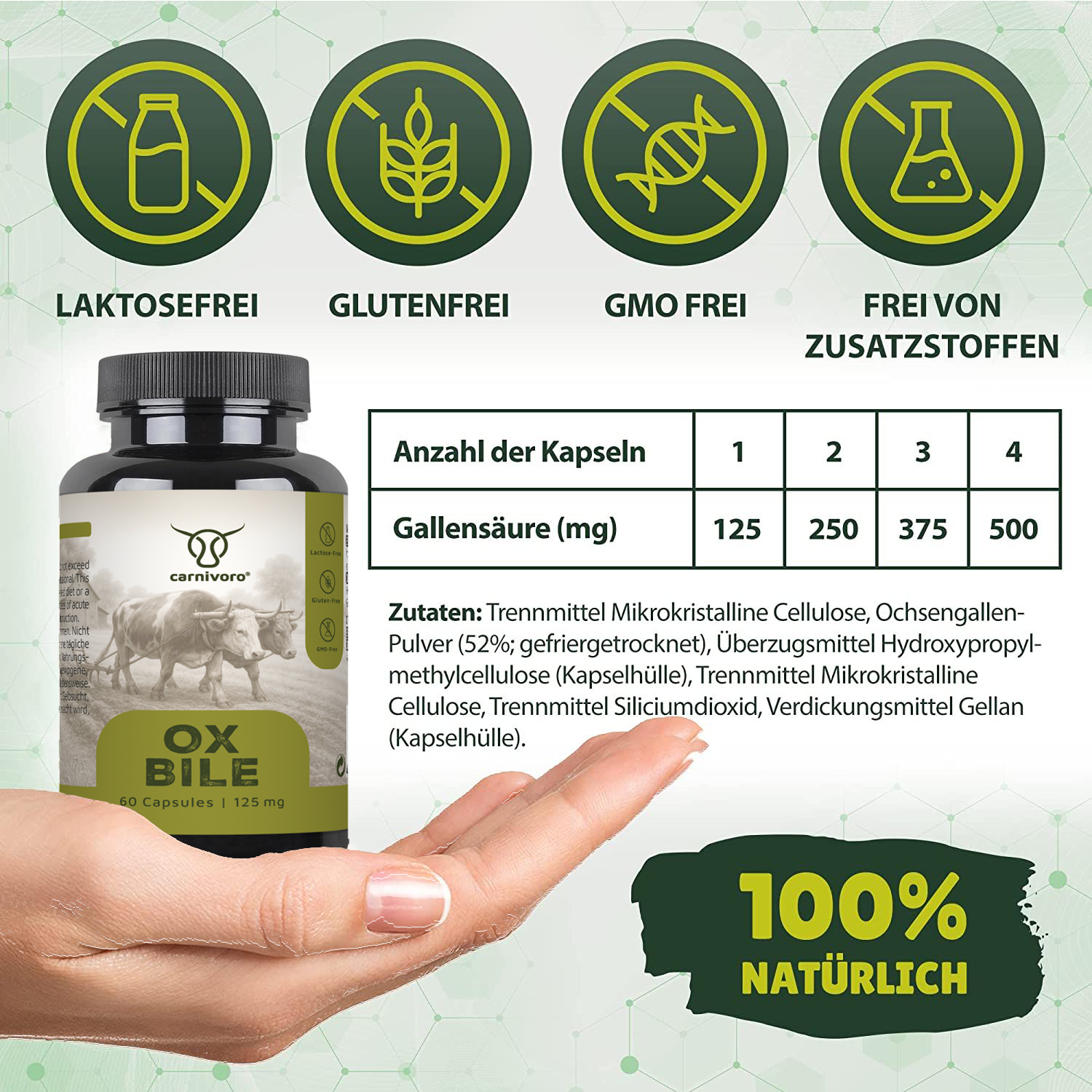 - Capsules de poudre avec poudre de bile de bœuf naturelle. Sans gluten, sans produits laitiers et sans OGM.